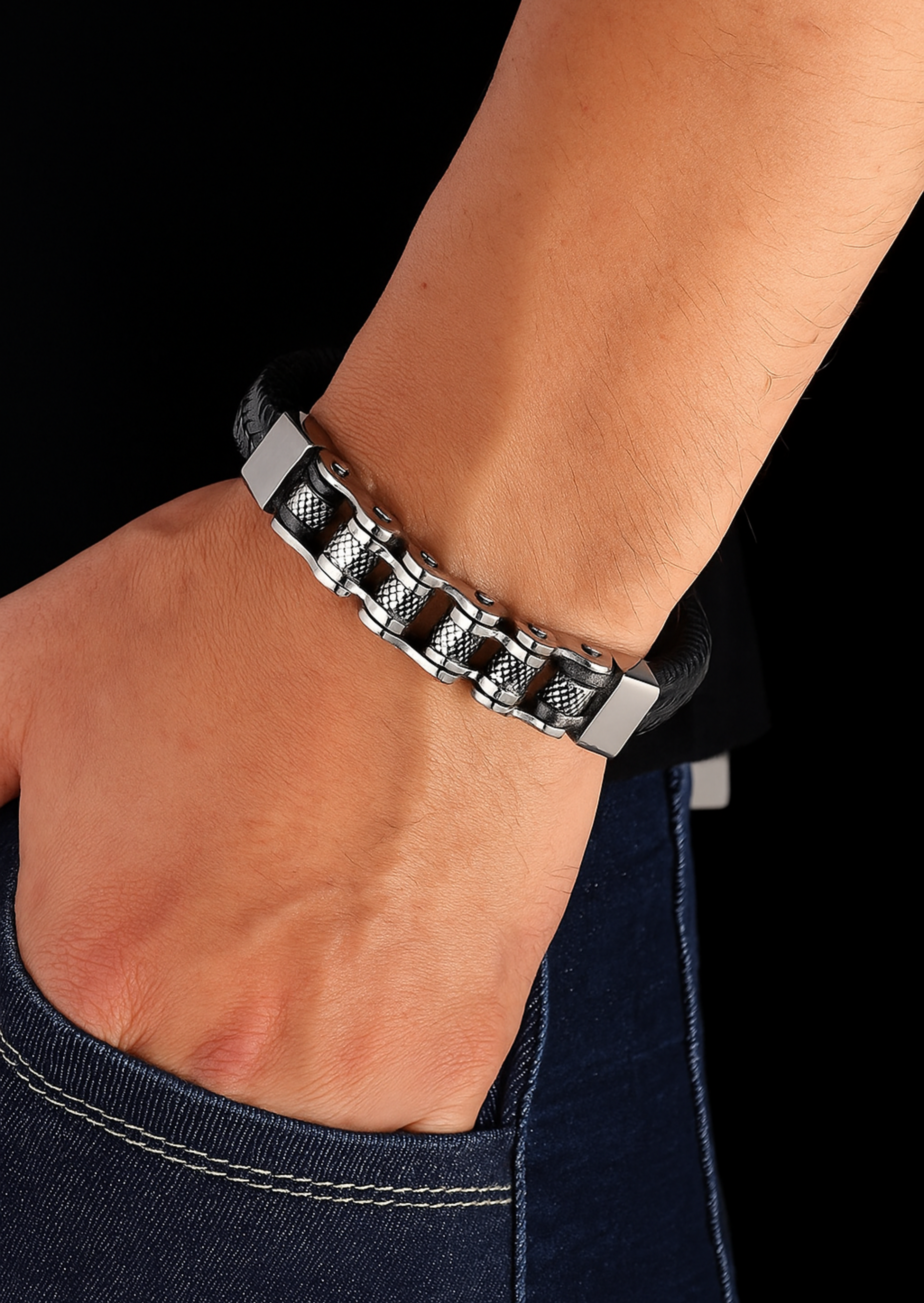 - Tipo de Cadena: Eslabones; La parte en acero inoxidable y Tipo Cuerda Trenzado; La parte en cuero